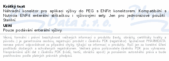 Náhradní konektor pro aplikaci výživy do PEG s ENFit konektorem. Kompatibilní s Nutricia ENFit enterální stříkačkou i výživovými sety. Jen pro jednorázové použití. Sterilní.