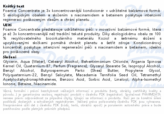 Foamie Concentrate je 3x koncentrovanější kondicionér v udržitelné balzámové formě. S ekologickým obalem a složením s niacinamidem a betainem poskytuje intenzivní regeneraci poškozeným vlasům a chrání planetu.