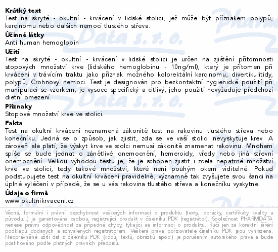 Test na skryté - okultní - krvácení v lidské stolici, jež může být příznakem polypů, karcinomu nebo dalších nemocí tlustého střeva.