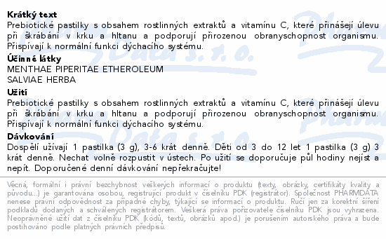 Prebiotické pastilky s obsahem rostlinných extraktů a vitamínu C, které přinášejí úlevu při škrábání v krku a hltanu a podporují přirozenou obranyschopnost organismu. Přispívají k normální funkci dýchacího systému.