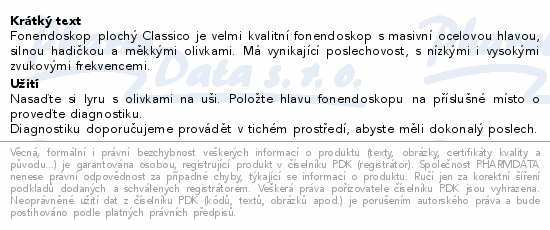 Fonendoskop plochý Classico je velmi kvalitní fonendoskop s masivní ocelovou hlavou, silnou hadičkou a měkkými olivkami. Má vynikající poslechovost, s nízkými i vysokými zvukovými frekvencemi.