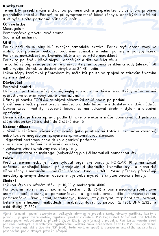 Téměř bílý prášek s vůní a chutí po pomerančích a grapefruitech, určený pro přípravu perorálního roztoku. Podává se při symptomatické léčbě zácpy u dospělých a dětí od 8 let výše. Čtěte pozorně příbalový leták.