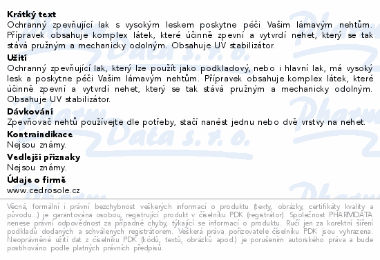 Ochranný zpevňující lak s vysokým leskem poskytne péči Vašim lámavým nehtům. Přípravek obsahuje komplex látek, které účinně zpevní a vytvrdí nehet, který se tak stává pružným a mechanicky odolným. Obsahuje UV stabilizátor.
