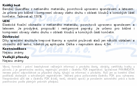 Bandáž Guardflex z netkaného materiálu, povrchově upraveno spandexem a latexem. Je určena pro běžné i kompresní obvazy všeho druhu v oblasti kloubů a konických částí končetin. Tažnost až 150%.