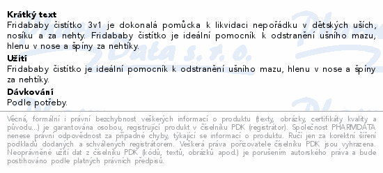 Fridababy čistítko 3v1 je dokonalá pomůcka k likvidaci nepořádku v dětských uších, nosíku a za nehty. Fridababy čistítko je ideální pomocník k odstranění ušního mazu, hlenu v nose a špíny za nehtíky.