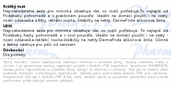 Nepostradatelná sada pro miminka obsahuje vše, co rodič potřebuje.To nejlepší od Fridababy pohromadě a v praktickém pouzdře. Ideální na domácí použití i na cesty, nosní odsávačka s filtry, rektální rourka, kleštičky na nehty, DermaFrida silikonová žínka.