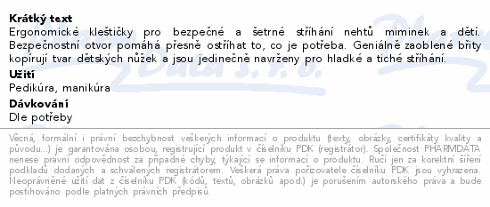 Ergonomické kleštičky pro bezpečné a šetrné stříhání nehtů miminek a dětí. Bezpečnostní otvor pomáhá přesně ostříhat to, co je potřeba. Geniálně zaoblené břity kopírují tvar dětských nůžek a jsou jedinečně navrženy pro hladké a tiché stříhání.