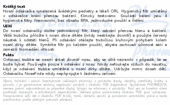 Nosní odsávačka vynalezená švédskými pediatry a lékaři ORL. Hygienický filtr umístěný v odsávačce brání přenosu bakterií. Klinicky testováno. Součástí balení jsou 4 hygienické filtry. Neinvazivní, bez obsahu BPA, jednoduché použití a čistění.
