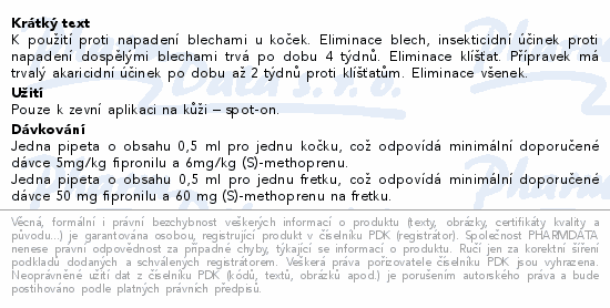 K použití proti napadení blechami u koček. Eliminace blech, insekticidní účinek proti napadení dospělými blechami trvá po dobu 4 týdnů. Eliminace klíšťat. Přípravek má trvalý akaricidní účinek po dobu až 2 týdnů proti klíšťatům. Eliminace všenek.