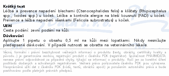 Léčba a prevence napadení blechami (Ctenocephalides felis) a klíšťaty (Rhipicephalus spp., Ixodes spp.) u koček. Léčba a kontrola alergie na bleší kousnutí (FAD) u koček. Prevence a léčba napadení všenkami (Felicola subrostratus) u koček.