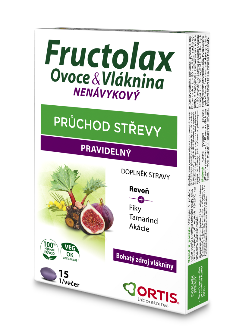 Fructolax obsahuje výtažky z ovoce a vlákninu, které ovlivňují průchod střevy a pravidelnou střevní pasáž.