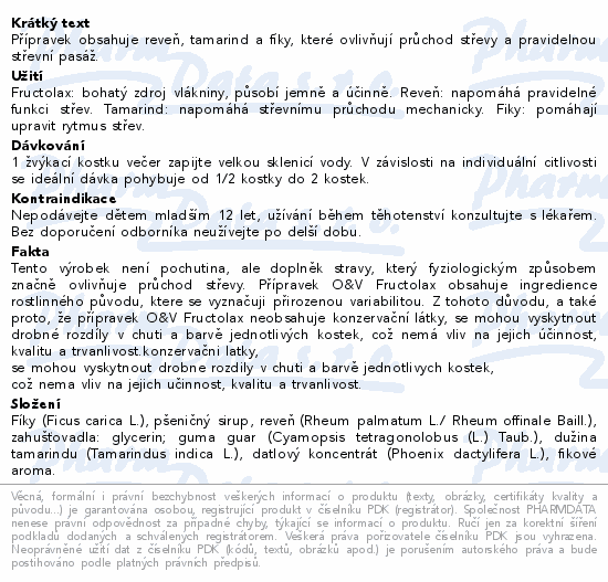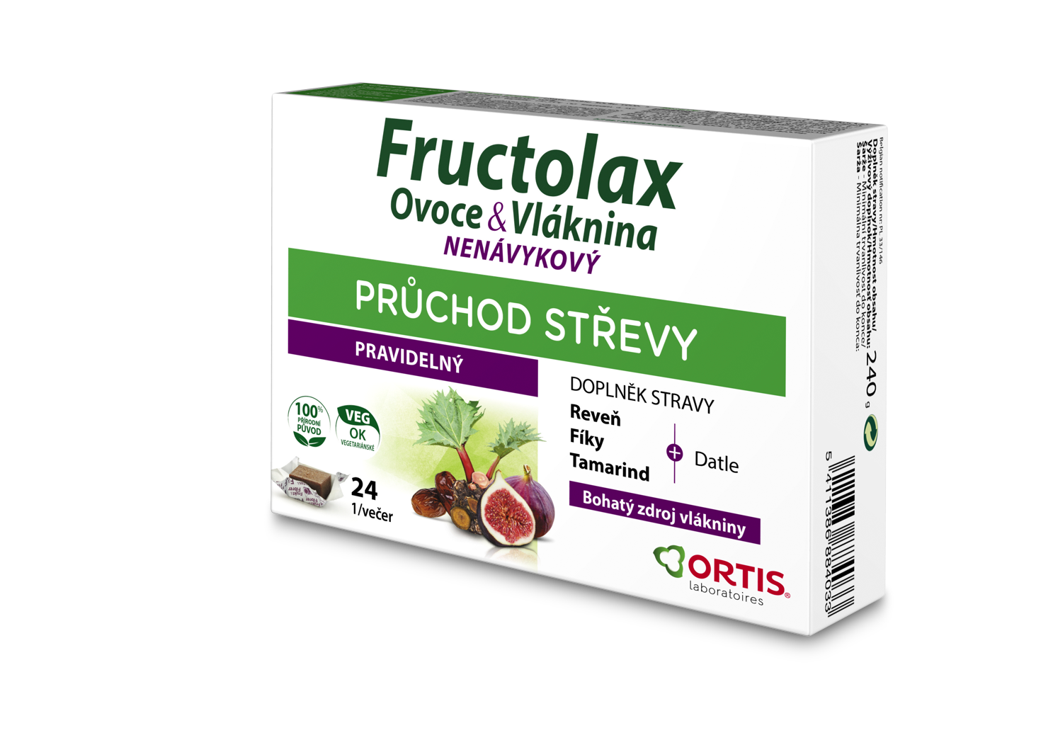 Fructolax obsahuje výtažky z ovoce a vlákninu, které ovlivňují průchod střevy a pravidelnou střevní pasáž.