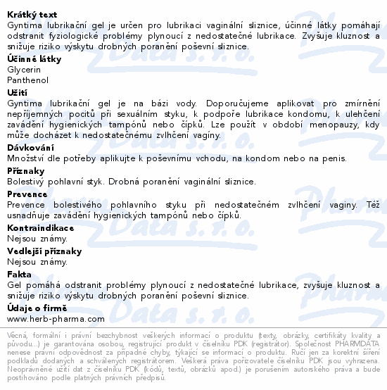 Gyntima lubrikační gel je určen pro lubrikaci vaginální sliznice, účinné látky pomáhají odstranit fyziologické problémy plynoucí z nedostatečné lubrikace. Zvyšuje kluznost a snižuje riziko výskytu drobných poranění poševní sliznice.
