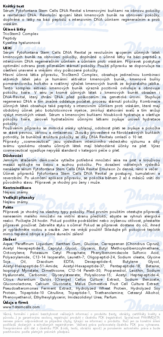 Sérum Fytofontana Stem Cells DNA Revital s kmenovými buňkami na obnovu pokožky a revitalizaci DNA. Revoluční spojení látek kmenových buněk na obnovení pokožky, doplněné o látky na bázi peptidů s intenzivním DNA účinkem regeneračním a proti vráskám.