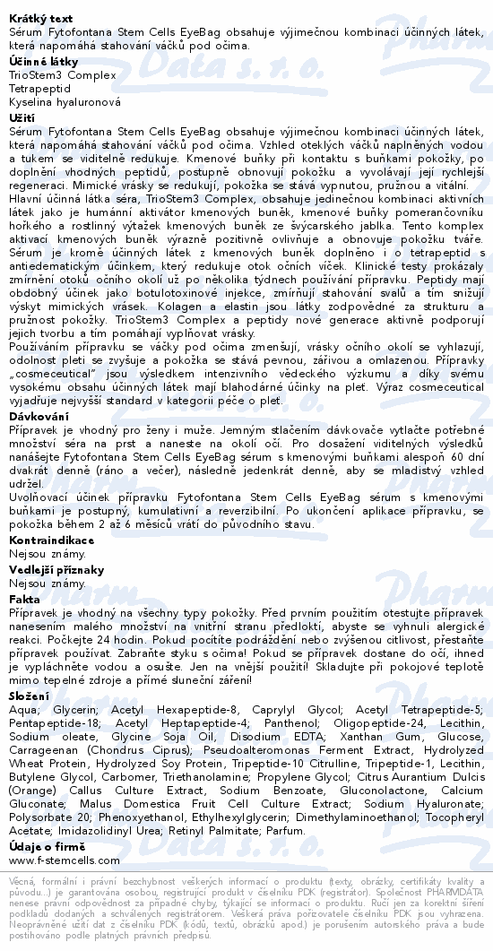 Sérum Fytofontana Stem Cells EyeBag obsahuje výjimečnou kombinaci účinných látek, která napomáhá stahování váčků pod očima.