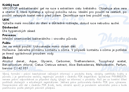 VIROSTOP antibakteriální gel na ruce s extraktem cistu krétského. Obsahuje aloe vera a vitamin E, které hydratují a vyživují pokožku rukou. Ideální pro použití na cestách, po použití veřejných toalet nebo před jídlem. Dezinfikuje ruce bez použití vody.