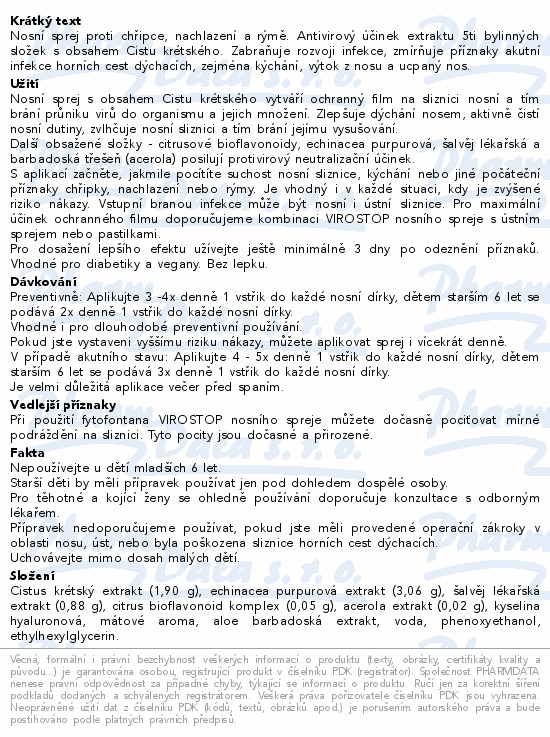 Nosní sprej proti chřipce, nachlazení a rýmě. Antivirový účinek extraktu 5ti bylinných složek s obsahem Cistu krétského. Zabraňuje rozvoji infekce, zmírňuje příznaky akutní infekce horních cest dýchacích, zejména kýchání, výtok z nosu a ucpaný nos.