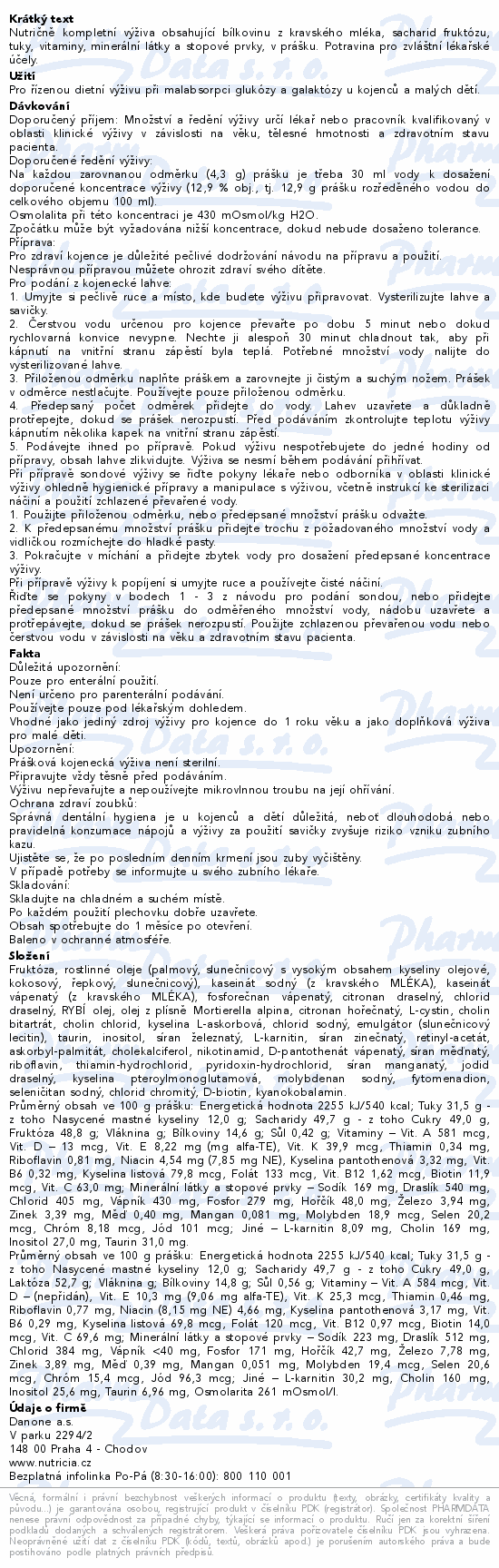 Nutričně kompletní výživa obsahující bílkovinu z kravského mléka, sacharid fruktózu, tuky, vitaminy, minerální látky a stopové prvky, v prášku. Potravina pro zvláštní lékařské účely.