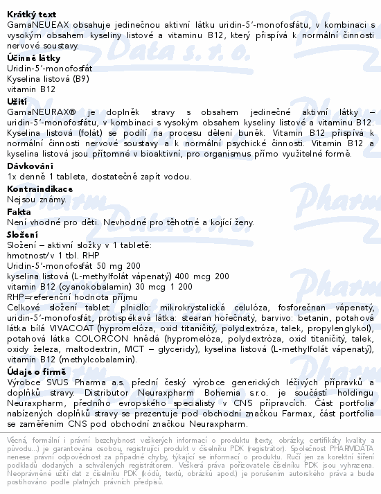GamaNEUEAX obsahuje jedinečnou aktivní látku uridin-5‘-monofosfátu, v kombinaci s vysokým obsahem kyseliny listové a vitaminu B12, který přispívá k normální činnosti nervové soustavy.