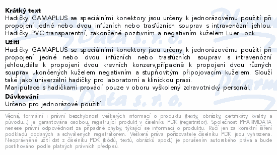 Hadičky GAMAPLUS se speciálními konektory jsou určeny k jednorázovému použití při propojení jedné nebo dvou infúzních nebo trasfúzních souprav s intravenózní jehlou. Hadičky PVC transparentní, zakončené pozitivním a negativním kuželem Luer Lock.