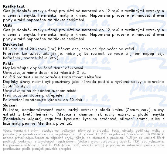Gas je doplněk stravy určený pro děti od narození do 12 roků s rostlinnými extrakty a silicemi z fenyklu, heřmánku, máty a kmínu. Napomáhá přirozeně eliminovat střevní plyny a také napomáhá zmírňovat nadýmání.