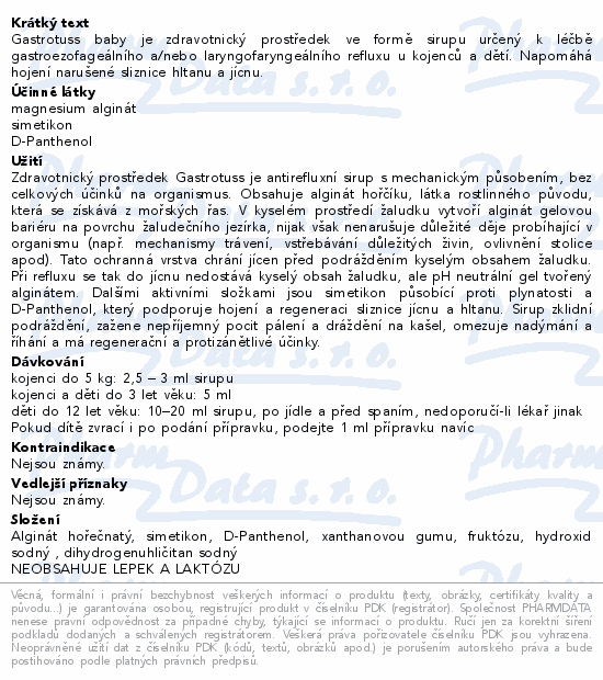 Gastrotuss baby je zdravotnický prostředek ve formě sirupu určený k léčbě gastroezofageálního a/nebo laryngofaryngeálního refluxu u kojenců a dětí. Napomáhá hojení narušené sliznice hltanu a jícnu.