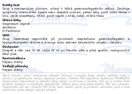 Sirup s mechanickým účinkem, určený k léčbě gastroezofageálního refluxu. Zmírňuje symptomy onemocnění: kyselé nebo zásadité zvracení, pálení žáhy, pocit cizího tělesa v krku, zánět nosohltanu, říhání, pocit napětí v břiše, kašel, změna hlasu.