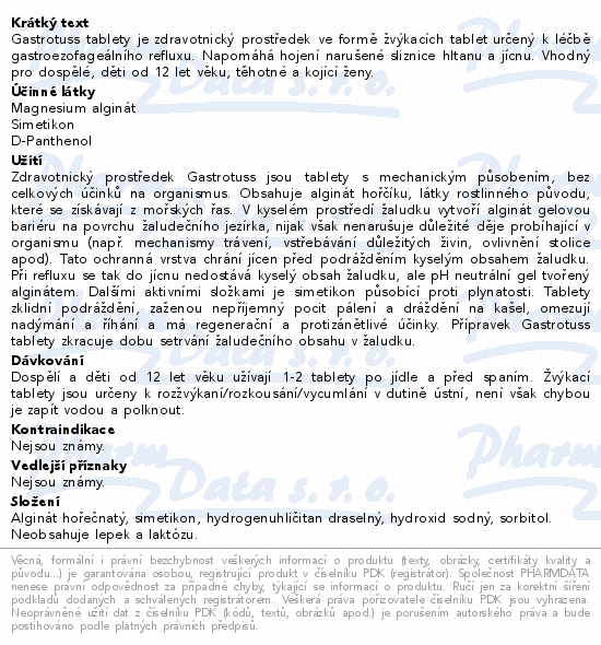 Gastrotuss tablety je zdravotnický prostředek ve formě žvýkacích tablet určený k léčbě gastroezofageálního refluxu. Napomáhá hojení narušené sliznice hltanu a jícnu. Vhodný pro dospělé, děti od 12 let věku, těhotné a kojící ženy.