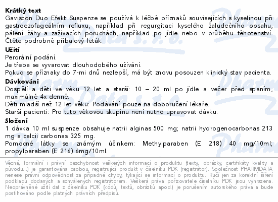Gaviscon Duo Efekt obsahuje účinné látky: natrii alginas 500 mg, natrii hydrogenocarbonas 213 mg a calcii carbonas 325 mg v 10 ml suspenze.