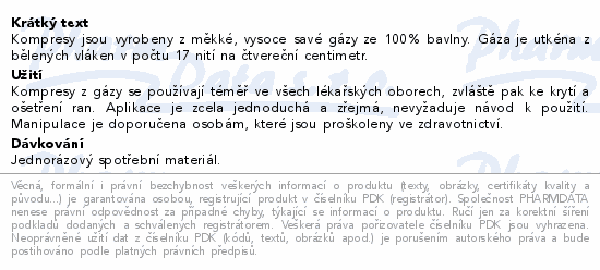 Kompresy jsou vyrobeny z měkké, vysoce savé gázy ze 100% bavlny. Gáza je utkéna z bělených vláken v počtu 17 nití na čtvereční centimetr.