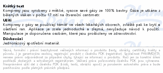 Kompresy jsou vyrobeny z měkké, vysoce savé gázy ze 100% bavlny. Gáza je utkána z bělených vláken v počtu 17 nití na čtvereční centimetr.