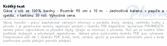 Gáza v roli ze 100% bavlny - Rozměr 90 cm x 10 m. - Jednotlivě baleno v papíře a igelitu, v kartónu 50 rolí. Výhodná cena.