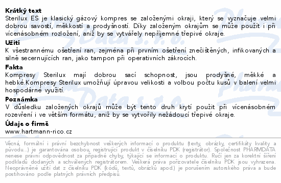 Sterilux ES je klasický gázový kompres se založenými okraji, který se vyznačuje velmi dobrou savostí, měkkostí a prodyšností. Díky založeným okrajům se může použít i při vícenásobném rozložení, aniž by se vytvářely nepříjemné třepivé okraje.