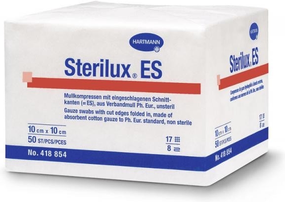 Kompresy z gázy, sterilní slouží k čistění, vysoušení a ošetření ran, popř. zastavení krvácení. Jsou vyrobeny z měkké, vysoce savé gázy ze 100% bavlny. Jsou prodyšné a jemné. mají hustotu 17nití na cm2. Kompresy jsou 8 vrstvé se založenými okraji.