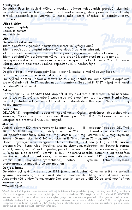 Geladrink Fast je kloubní výživa s vysokou dávkou kolagenních peptidů, vitamínů, minerálů a vysokou dávkou extraktu z Boswellie serraty, která pomáhá udržet klouby zdravé, podobně jako vitamín C nebo měď, které přispívají k dobrému stavu chrupavek.