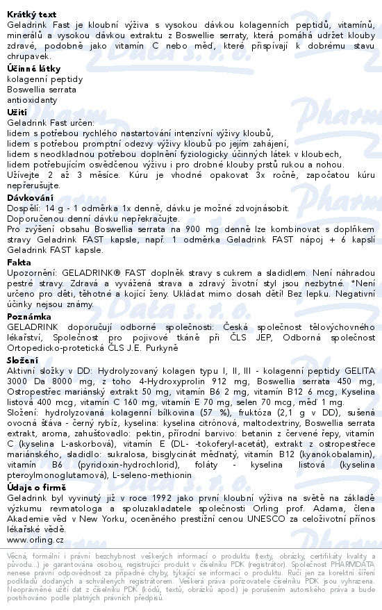 Geladrink Fast je kloubní výživa s vysokou dávkou kolagenních peptidů, vitamínů, minerálů a vysokou dávkou extraktu z Boswellie serraty, která pomáhá udržet klouby zdravé, podobně jako vitamín C nebo měď, které přispívají k dobrému stavu chrupavek.