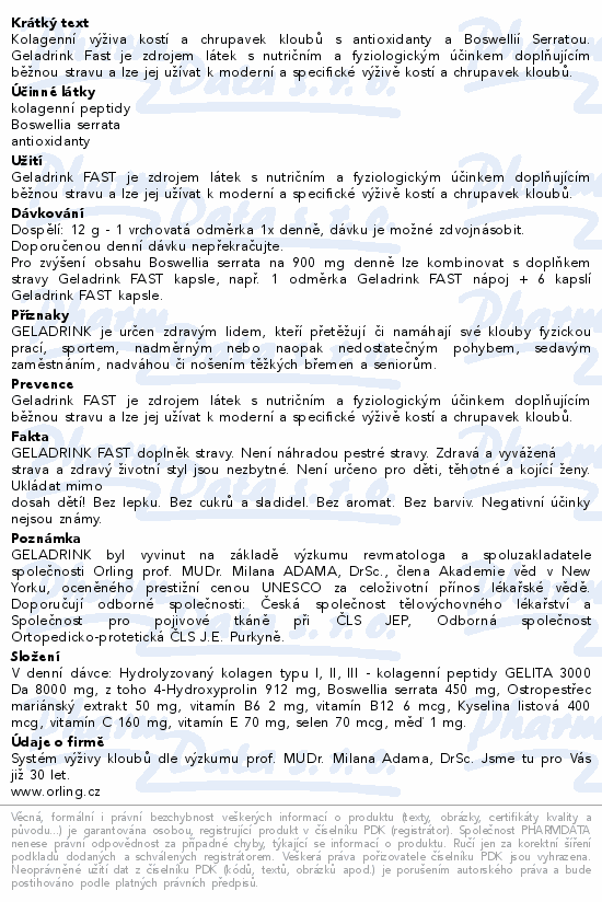 Kolagenní výživa kostí a chrupavek kloubů s antioxidanty a Boswellií Serratou. Geladrink Fast je zdrojem látek s nutričním a fyziologickým účinkem doplňujícím běžnou stravu a lze jej užívat k moderní a specifické výživě kostí a chrupavek kloubů.