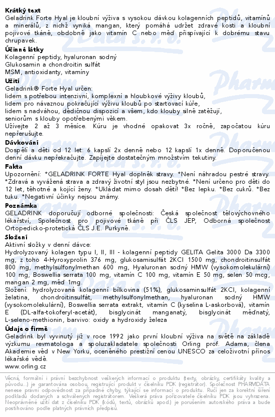 Geladrink Forte Hyal je kloubní výživa s vysokou dávkou kolagenních peptidů, vitamínů a minerálů, z nichž vyniká mangan, který pomáhá udržet zdravé kosti a kloubní pojivové tkáně, obdobně jako vitamín C nebo měď přispívající k dobrému stavu chrupavek.
