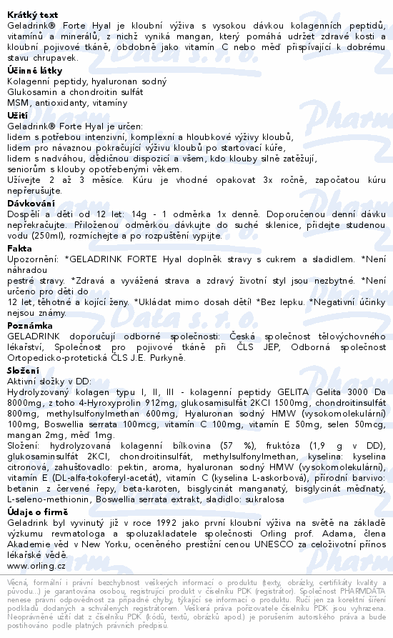 Geladrink® Forte Hyal je kloubní výživa s vysokou dávkou kolagenních peptidů, vitamínů a minerálů, z nichž vyniká mangan, který pomáhá udržet zdravé kosti a kloubní pojivové tkáně, obdobně jako vitamín C nebo měď přispívající k dobrému stavu chrupavek.