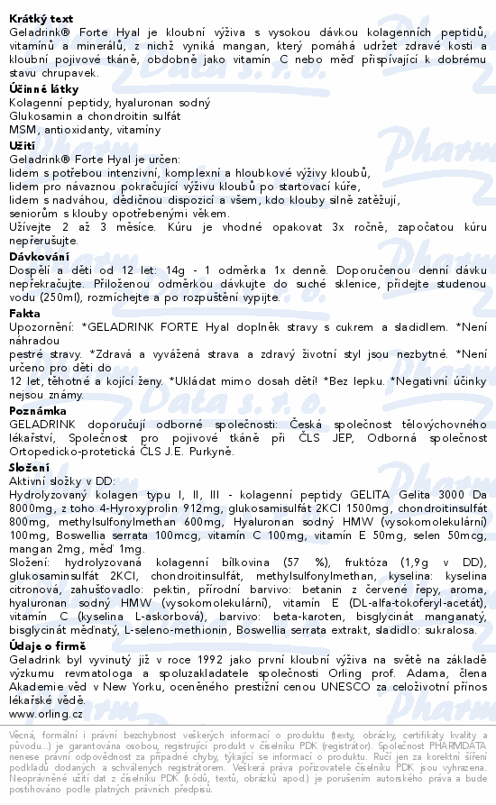 Geladrink® Forte Hyal je kloubní výživa s vysokou dávkou kolagenních peptidů, vitamínů a minerálů, z nichž vyniká mangan, který pomáhá udržet zdravé kosti a kloubní pojivové tkáně, obdobně jako vitamín C nebo měď přispívající k dobrému stavu chrupavek.