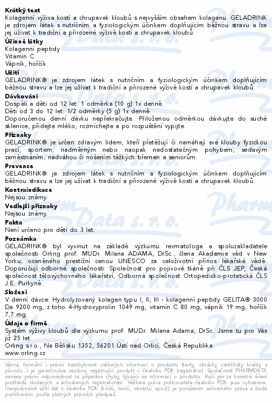 Kolagenní výživa kostí a chrupavek kloubů s nejvyšším obsahem kolagenu. GELADRINK je zdrojem látek s nutričním a fyziologickým účinkem doplňujícím běžnou stravu a lze jej užívat k tradiční a přirozené výživě kostí a chrupavek kloubů.