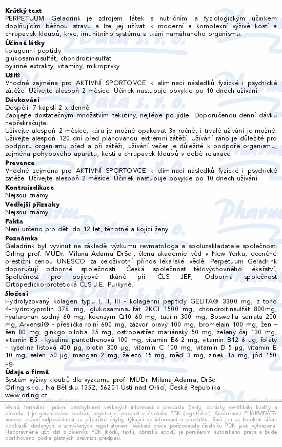 PERPETUUM Geladrink je zdrojem látek s nutričním a fyziologickým účinkem doplňujícím běžnou stravu a lze jej užívat k moderní a komplexní výživě kostí a chrupavek kloubů, krve, imunitního systému a tkání namáhaného organismu.