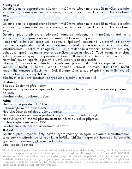 Gelatina plus představuje jedinečný komplex kolagenu a minerálních látek a s vitaminem C pro správnou výživu a funkčnost kloubního aparátu. Gelatina plus je doporučována ženám i mužům ve středním a pozdějším věku, aktivním sportovcům, lidem s nadváhou a všem, kteří si chtějí udržet kosti a klouby v dobrém stavu. Kolagenní prémiové spektrum poskytuje špičkový inovativně upravený bílkovinný komplex s optimálním spektrem kolagenních látek, v nejvyšší čistotě a dokonalou vstřebatelností. Spektrum kolagenů I, II, III je základním stavebním kamenem pro celý pohybový aparát, zejména pro chrupavčitou výstelku kloubů. Tvoří pevná a ohebná vlákna, která se vyskytují v pouzdrech kloubů, tkáních kostí, šlach a vazů, ale i kůži. Normální kloubní aparát je pevný, pružný, vzdoruje tlaku a zátěži.