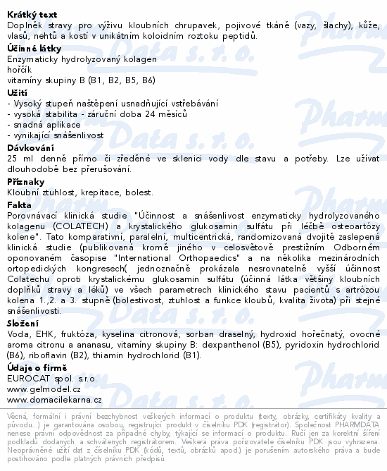 Doplněk stravy pro výživu kloubních chrupavek, pojivové tkáně (vazy, šlachy), kůže, vlasů, nehtů a kostí v unikátním koloidním roztoku peptidů.