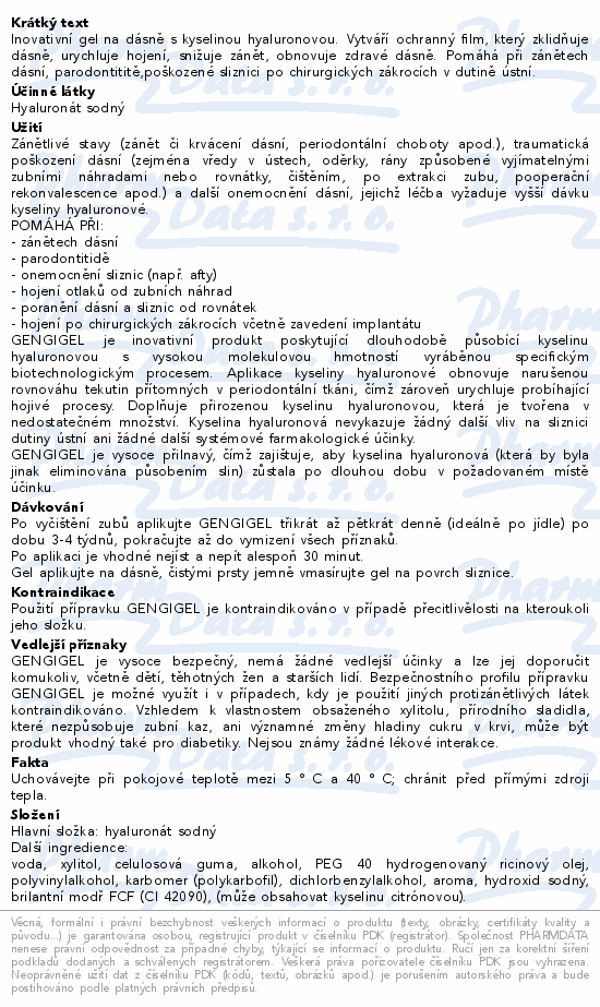 Inovativní gel na dásně s kyselinou hyaluronovou. Vytváří ochranný film, který zklidňuje dásně, urychluje hojení, snižuje zánět, obnovuje zdravé dásně. Pomáhá při zánětech dásní, parodontititě,poškozené sliznici po chirurgických zákrocích v dutině ústní.