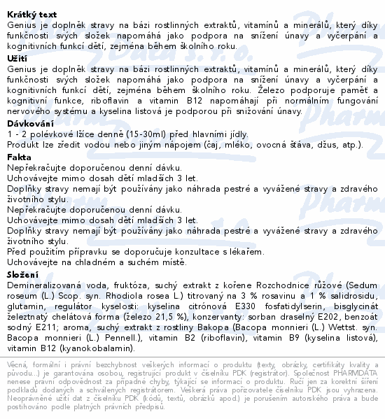 Genius je doplněk stravy na bázi rostlinných extraktů, vitamínů a minerálů, který díky funkčnosti svých složek napomáhá jako podpora na snížení únavy a vyčerpání a kognitivních funkcí dětí, zejména během školního roku.