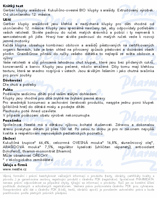 Gerber křupky arašídové. Kukuřično-ovesné BIO křupky s arašídy. Extrudovaný výrobek. Od ukončeného 12. měsíce.