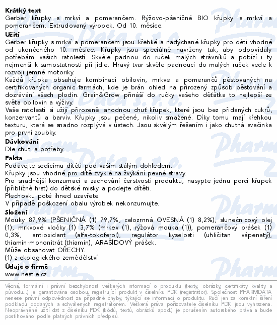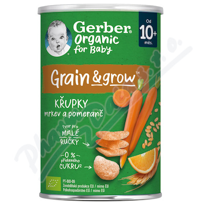 Gerber křupky s mrkví a pomerančem. Rýžovo-pšeničné BIO křupky s mrkví a pomerančem. Extrudovaný výrobek. Od 10. měsíce.
