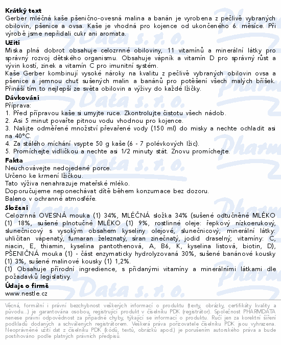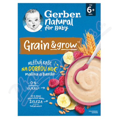 Gerber mléčná kaše pšenično-ovesná malina a banán je vyrobena z pečlivě vybraných obilovin, pšenice a ovsa. Kaše je vhodná pro kojence od ukončeného 6. měsíce. Při výrobě jsme nepřidali cukr ani aromata.
