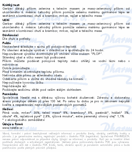 Gerber dětský příkrm zelenina s telecím masem je maso-zeleninový příkrm od ukončeného 6. měsíce. Lahodný příkrm pomůže vašemu malému gurmánovi lépe se seznámit s kombinací chutí a brambor, mrkve, rajčat a telecího masa.